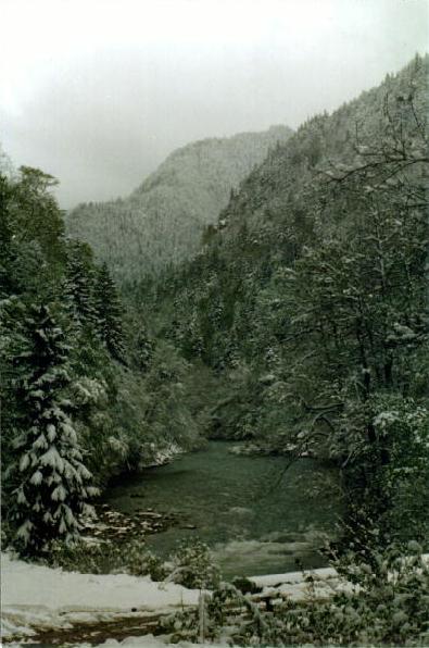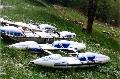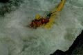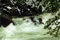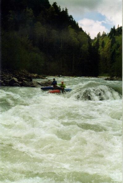 Повреждения: Две согнутые поперечины у ката Кирилла и Сереги, сломанная кница левого баллона третьей поперечины и погнутая в этом месте продолина у "Хавроньи". При разборе полетов были сделаны выводы, что в стабильном состоянии (нахождение Гули с катом в улове у левого берега под "Прощай Родина") не следует хватать первую попавшуюся морковку (которая может оказаться и без карабина) а ждать стопроцентного шанса. С параллельной группой возникли некоторые трения по поводу, что мы всей группой сняли страховку у "Прощай Родина" и ушли в догонку за перевернувшимся катом, создав тем самым трудности в прохождении порога их группе, четверка которой также ушла за Гулей. В наше оправдание можно привести доводы о том, что положение параллельной группы было конечно тяжелым, но не критическим, в отличии от нас, учитывая, что Гулю унесло в каньон и никакой информации о ней мы не располагали. Причем, учитывая далеко не нулевую вероятность оверкиля, в "Сосновом" нам могли понадобится все наши суда. 5 мая. Подъем в 7:00. Вышли в 10:19. До начала каньона "Малый Блып", заканчивающимся порогом "Щель" около 10-12 минут ЧХВ. Ориентир начала каньона - река делает правый, а затем крутой левый поворот, перед правым поворотом - входом в каньон у левого берега обломок скалы пиромидальной формы и завал плавника. Дорога подходит к реке и хорошо видна с воды. Через 150 м. крутой правый поворот с прижимом к скальному выступу и косой бочкой у левого берега. Проходили по внутренней стороне поворота, заходя у правого берега. Далее следует технический участок с маневрами между камней. На выходе из Каньона русло сужается и реку перегораживает бочка. Слева проносной язык, справа пенный котел. Кирилл с Серегой опять залегли. Кирилл зацепился за кат и его вынесло из бочки, Сергей остался полоскаться. Единственное, что мы успели это уйти чуть влево и упали в бочку гадая, не раздавили ли Сергея. Когда мы прошли бочку и я оглянулся назад у меня внутри все похолодело - Сергея в бочке не было. Правда спустя секунду я увидел его плывущего чуть правее нас. После выхода из "Щели" участок спокойной воды. Волков благополучно добрался вплавь (кролем) до берега, выпустив при этом весло, которое было поймано нашим катом. После поимки Серегиного весла мы и подоспевший Макс занялись спасением катамарана с Кириллом.Однако затолкать кат и плавающего рядом человека в улово не удалось. Кирилл был взят на борт (скорее на раму) двойки, а перевернутый кат был передан подоспевшей четверке. Кирилл был высажен на берег, а двойка и каяк ушли вдогонку за четверкой и перевернутым катом. Но, как оказалось, они и сами люди взрослые и, когда мы подошли, двойка уже была загнанна в улово (11:50). У девичьей двойки при прохождении каньона порвался упор и им пришлось зачалиться в середине каньона. Их ждали около часа (починить упор им помогали Макс с Лехой). в 12:50 отплыли дальше. До автомобильного моста (ориентир начала "Соленых скал" 10 минут ЧХВ. По дороге есть места для стоянок. Чалка за