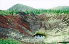 (Д.Г. - Несколько слов о дороге на источники. Это колея, проходящая по склонам гор, иногда по болотинам, а в одном месте - прямо по руслу р. Сенца. Здесь в реку упирается береговая скала. Когда мы шли на Хойто-Гол, вода была высокая, водитель высадил из УРАЛа всех пассажиров, УРАЛ прыгнул с берега в воду и проехал вверх по течению метров 300. Вода при этом перехлестывала через капот и сливалась с лобового стекла. После этого водитель вылез из машины и на вопрос: "Ну как?" ответил: "Все нормально", выпив предварительно стакан архе.)
