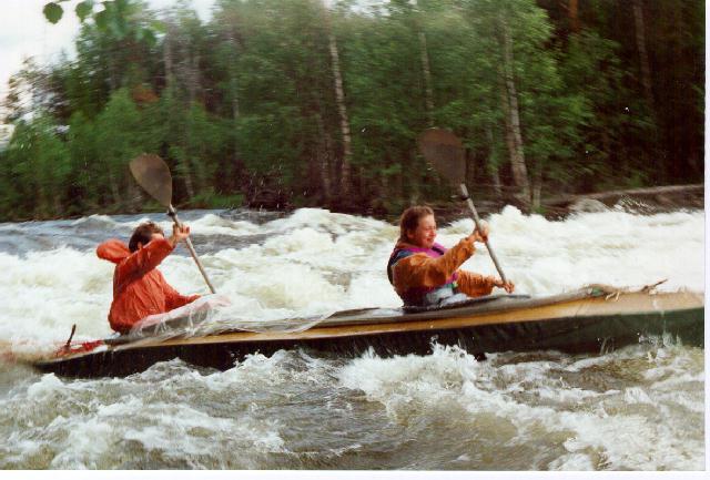 Проводимся вдоль левого берега. Есть ручеек и в обход моста. После пары сотен метров проводки удается чуть-чуть проплыть между островами проталкиваясь уже по более мягкой шиверке. Перед поворотом, из-за которого доносится рев, экстренно чалимся. Время близко к 9-ти вечера. Ну, дальше, как всегда, обнос около несколько сот метров по болотной тропе по левому берегу на берег озера Ориярви. Уже в полном дауне мельком смотрим на главный слив. Все 16 метров высаживаются на эффектном, изогнутом, более или менее ровном сливе максимум 100 метровой длины. Увы, освещение и состояние не позволили это сфотографировать. Более опытный напарник - Сергей - сказал: У! здесь можно покататься (на Т2). На следующий день этого желания не проявилось :-). В целом, слив выглядел менее драконовским в смысле камней, чем все остальное.