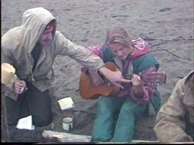 берегу в травке. Дежурят Коля с Олей, на ужин пюре и халва. Очень холодно, все довольно