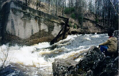 Примерно в 1км ниже плотины после